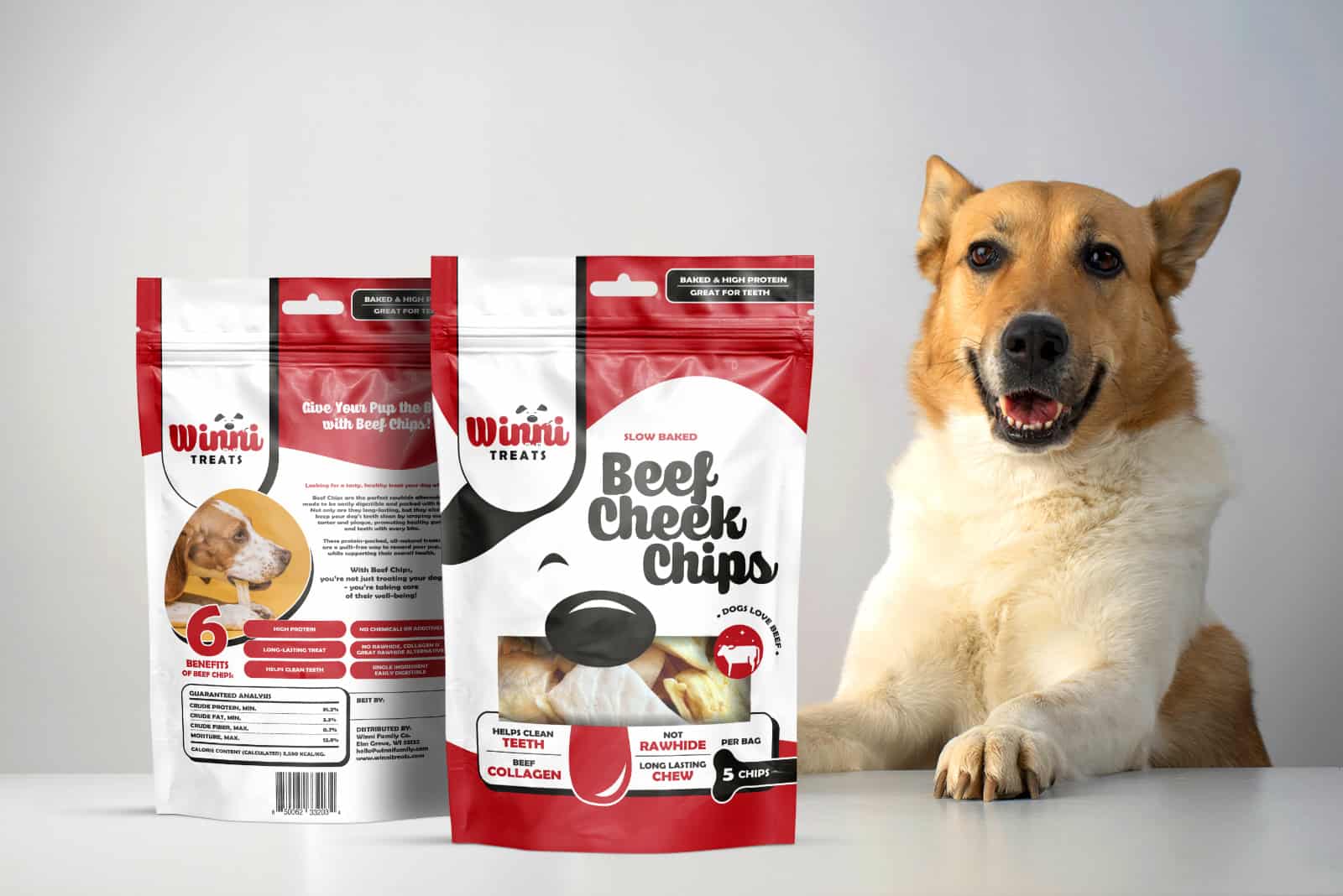 The design communicates quality and transparency, with the dog’s joyful presence reinforcing trust and affection — even before the product is opened.
